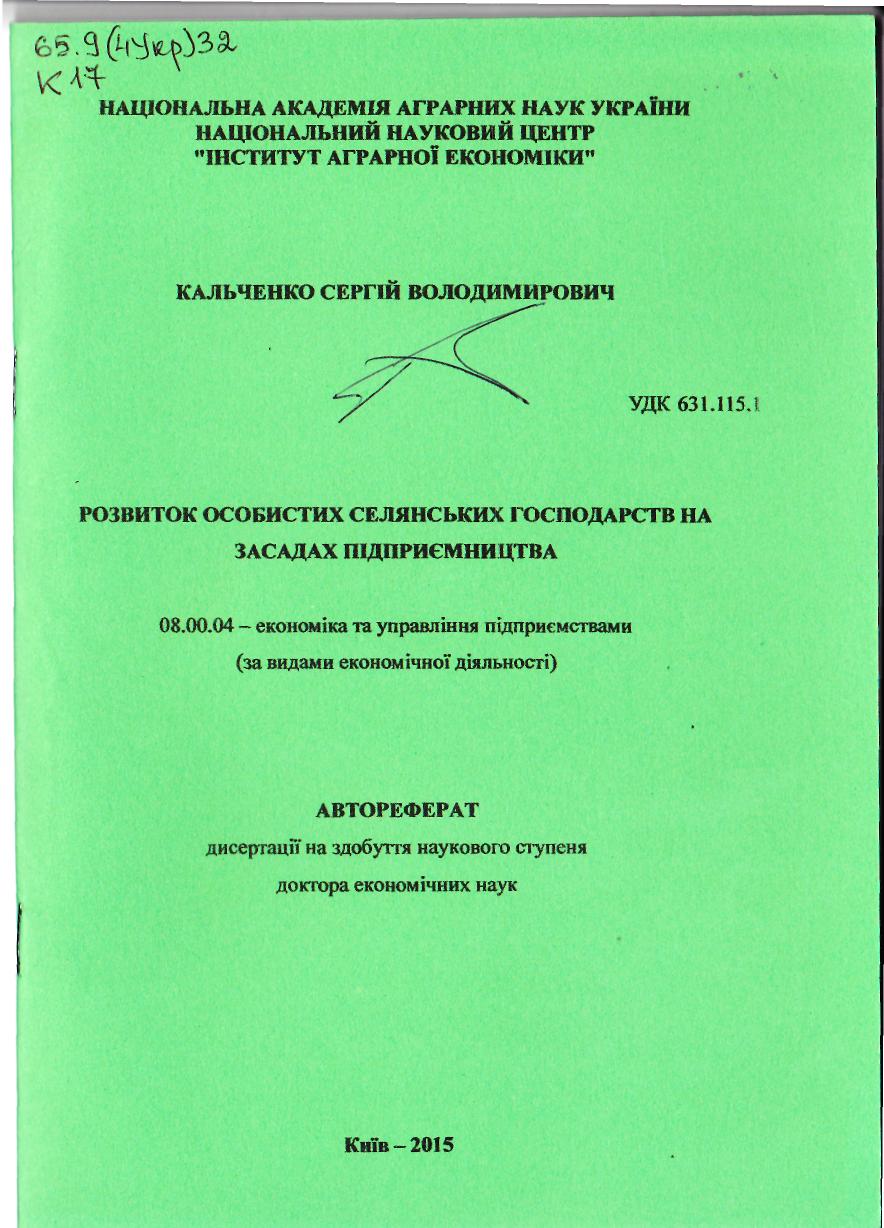Розвиток особистих селянських господарств на засадах підприємництва [Текст] : автореферат дис. … д-ра екон. наук : 08.00.04 / С. В. Кальченко. – К. : [б. и.], 2015. – 34 с.